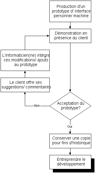Le prototypage rapide est une méthode populaire de générer les premières interfaces à soumettre au client, et servent souvent à obtenir une approbation de départ pour le développement d'un système muni d'interfaces personne/ machine. L'acceptation d'un prototype par un client n'est pas garante, en soi, de son accord sur le produit final, même s'il respecte en totalité le prototype initial. La vision du produit par client évolue dans le temps, ses besoins et envies aussi, et on ne parle pas ici de la perception de l'équipe de développement du produit, qui fait parfois des réalisations importantes en chemin qui demandes ou commandent d'elles-mêmes des modifications. Conserver précieusement une «trace papier» de contrats et accords signés entre la compagnie et le client est toujours une bonne idée. Le prototype, lorsqu'accepté, peut parfois servir de levier de négociations, mais son rôle est surtout d'aider le client et les analystes à s'entendre sur une vision commune de ce qui est attendu de l'interface personne/ machine d'un système. |