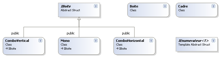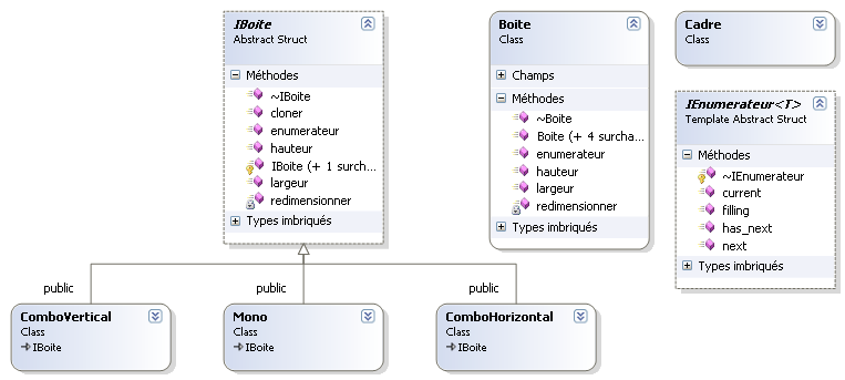 À titre d'exemple, pour mes fins, la classe ComboVertical::Enumerateur dérive d'IEnumerateur<IBoite::str_type> et fait en sorte que j'itère d'abord sur la section du haut, puis (brièvement) sur la « section » du centre, puis sur la section du bas, ce qui cache à la Boite englobante les détails d'implémentation de ce qu'elle « contient ».