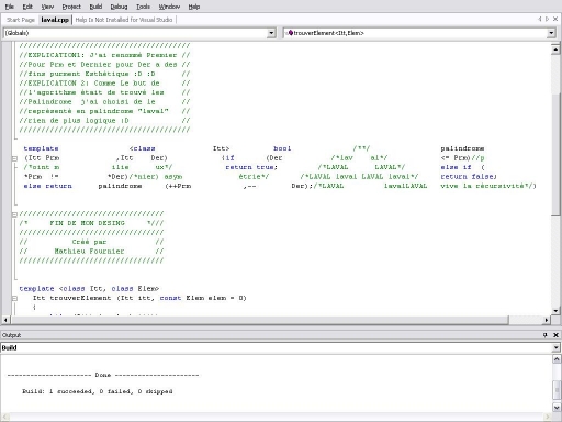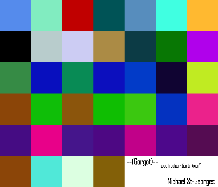 Michaël St-Georges, étudiant en informatique S2 à la session H2006 au Collège Lionel-Groulx, m'a soumis ceci. Le texte explicatif va comme suit : C'est pas une soumission officielle, mais je voudrais savoir ce que tu en pense à date... J'ai d'autres idées aussi, j'explore ça, mais celle là était facile à commencer ici... Chaque couleur est codée sur trois octets. On rassemble les octets en ordre RGB, et ça fait une belle fonction compilée pour déterminer si un nombre est un palindrome... Mais j'ai pensé à plein d'autres trucs... Peut-être en mélanger quelques uns. Je vais te tenir au courant des développements. Je dois indiquer que le fichier original était en format bitmap (.BMP). La version montrée à droite est un Portable Network Graphics (.PNG) pour fins d'économie de bande passante. Cela influence un peu le travail de Michaël puisque les données dans le fichier dépendent du format, alors il est important de le mentionner. Notez qu'il serait possible d'exprimer un algorithme sous forme d'image Bitmap, comme en fait foi http://www.iquilezles.org/blog/?p=1426 |