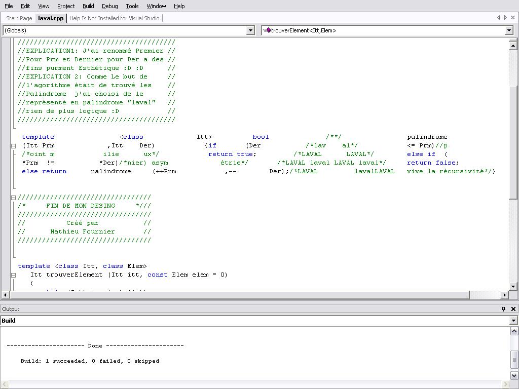 Michael Blondin, étudiant en informatique de gestion S4 à la session H2006 au Collège Lionel-Groulx, m'a soumis ceci (et il a raison de critiquer : je n'ai pas tenu à jour mon petit concours ci-dessus, faute d'avoir reçu des soumissions). Ceci nous donne un joli exemple de ce qui peut être fait. Le texte est verbatim de Michael (je n'ose pas appliquer de correctifs orthographiques ou grammaticaux à une construction poétique; j'espère que vous me le pardonnerez). |