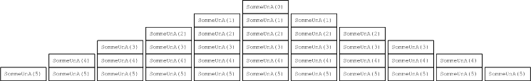Dans le schéma qui précède, en forme de pyramide, le pic de la pyramide représente le moment où on a atteint le coût maximal en ressources pour un appel original à somme_un_a(5). On imagine bien le coût de somme_un_a(10000), surtout en comparaison avec une stratégie itérative qui ne ferait que itérations dans une répétitive et qui, en ne se rappelant pas, ne nécessiterait qu'un seul appel à la fonction somme_un_a().
