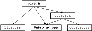 Supposons un petit projet fait de cinq fichiers, dont la relation d'inclusion est décrite par le schéma visible à gauche, où une flèche de A vers B y signifie A est inclus par B. À titre d'exemple, dans ce schéma, le fichier bits.h est inclus par octets.h et par UnProjet.cpp. |