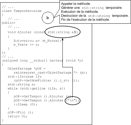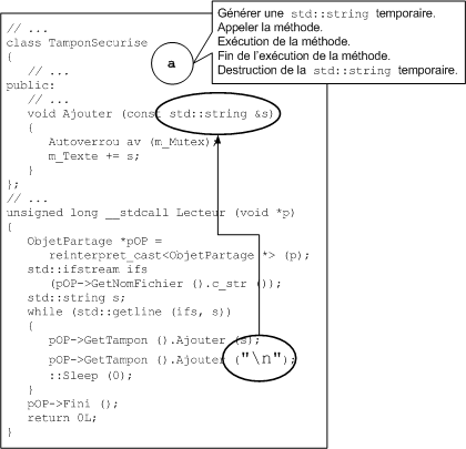 Le littéral "\n" est de type const char*. La classe TamponSecurise n'offre pas de méthode nommée ajouter() prenant en paramètre un const char*, mais propose par contre une méthode ajouter() prenant en paramètre un const std::string &. De plus, le type std::string propose un constructeur prenant en paramètre un const char*. Ne reste plus au moteur d'inférence de types de C++ qu'à faire le raccord et à solliciter automatiquement le constructeur en question pour générer une variable temporaire du type requis (const std::string&) à partir du type d'origine (const char*). C'est, en fait, tellement normal en apparence, tellement inscrit dans nos habitudes qu'on tend à oublier à quel point cette mécanique est... magique.