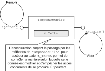 Selon toute probabilité, le code proposé devrait vous sembler encore inoffensif. En effet, la variable texte_ est celle qui, dans une instance de TamponSecurise, est protégée par le mutex m_, et celle-ci n'est plus accédée suite à l'accolade fermante du bloc anonyme inséré dans la méthode.
