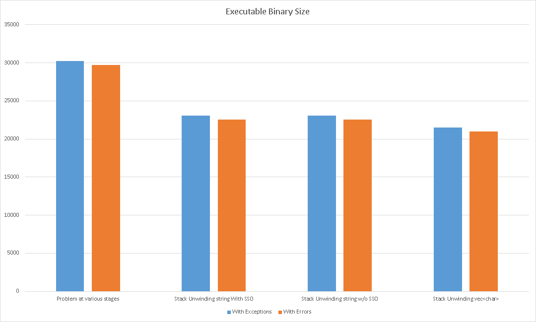 I cannot compare the impact of exception-handling code on binary size from compiler to compiler right now (I used to have gcc and MSVC on my laptop but had a hard drive crash last week and have not gone around to reinstalling gcc yet; it's a matter of time). I can however compare its impact on the binary sizes with MSVC 2015. Thus, for the test sets we have on this page, we have :