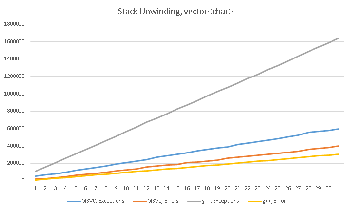 In the stack unwinding case with vector<char> instances, we have (lower is better, vertical axis is in mocroseconds, horizontal axis is function call depth):