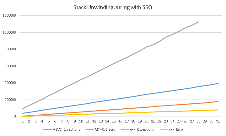 In the stack unwinding case with SSO-enabled string instances, we have (lower is better, vertical axis is in mocroseconds, horizontal axis is function call depth):