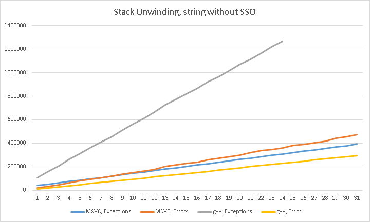 In the stack unwinding case with non-SSO-enabled string instances, we have (lower is better, vertical axis is in mocroseconds, horizontal axis is function call depth):
