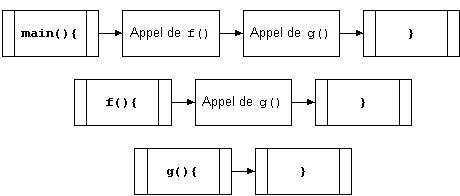 La fonction g() peut être appelée et de la fonction main(), et de la fonction f(). Ainsi, c'est le contexte de l'exécution du programme qui décidera, à tout moment, à quel endroit revenir lorsque la fonction g() terminera de s'exécuter.