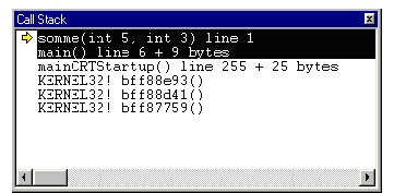 L'environnement intégré Visual Studio offre entre autres choses un outil appelé la pile d'appel (Call Stack). Celle-ci ne présente pas tous les détails propres à la pile d'exécution, mais permet de suivre (sous la forme d'une pile) la séquence d'appels de fonctions avec le dévermineur.