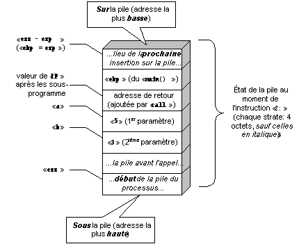 Pour être en mesure d'expliquer ces dernières considérations de manière compréhensible, il importe d'abord de faire un retour sur l'ensemble de la mécanique d'exécution d'un programme, pour voir où s'introduisent les problèmes propres aux sous-programmes, et pour comprendre les outils utilisés (souvent à notre insu) pour les régler.