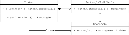La première est de mettre au point une interface de consultation de Rectangle (nommons-la RectangleConsultation) qui n'offre que des services de consultation[1], puis faire en sorte que Rectangle implémente cette interface. Ceci implique qu'il faille modifier Bouton pour que cette classe ne retourne que des RectangleConsultation et supprimer son mutateur setDimension(); en effet, l'immuabilité d'une interface ne garantit pas qu'il soit impossible qu'un objet susceptible de changer d'état à l'insu de son propriétaire se cache derrière elle. |