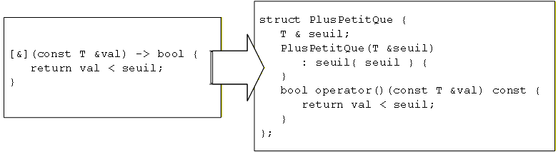 La liste de captures est ce qui apparaît entre crochets au début de la λ. Cette section permet de spécifier les éléments locaux à la fonction qui seront capturés par le foncteur une fois celui-ci généré par le compilateur. Les éléments globaux qui étaient accessibles là où la λ a été générée sont implicitement accessibles dans le corps de la λ (merci à Frédérick Martel-Lupien pour m'avoir fait remarquer ceci). Lorsque [] est spécifié (paire de crochets vide), cela signifie qu'aucune variable de l'environnement ne sera capturée. Cela correspond à un foncteur sans attributs et muni strictement d'un constructeur par défaut banal. La mention [&] signifie capturer par référence tous les éléments pertinents de l'environnement, alors que la mention [=] signifie capturer par copie tous les éléments pertinents de l'environnement. Dans notre exemple, la variable seuil est capturée par référence lors de la construction de la λ et peut donc être utilisée dans la définition de son opérateur (). Une capture par copie aurait aussi été correcte mais aurait pu être coûteuse si T::T(const T&) s'était avéré coûteux. Il est aussi possible d'y aller à la pièce (par exemple [&x,=y] pour capturer x par référence et y par copie). |