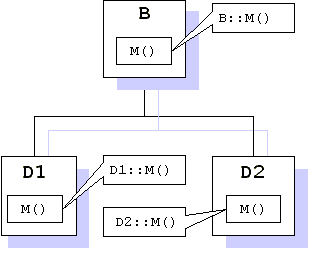 Le mot clé virtual utilisé comme préfixe à une méthode indique au compilateur que sur appel de cette méthode, il sera nécessaire d'inférer dynamiquement le type effectif de l'instance active et d'appeler la version la plus spécialisée de cette méthode, donc de ne pas se laisser prendre au jeu des apparences. Que B::M() soit virtual fait en sorte que D1::M() le soit aussi, et qu'il en soit de même pour D2::M(). Le caractère polymorphique d'une méthode est implicitement hérité. Cela signifie que les enfants de D1 ou de D2 pourraient spécialiser M à nouveau |