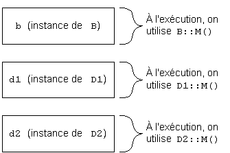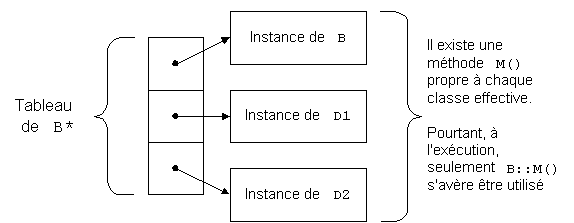 Dans la premier cas, nous avions un tableau tab de pointeurs à des B qui pointaient effectivement sur un B, un D1 et un D2. L'appel de leurs méthodes M() appelait toutefois B::M() dans chaque cas du fait que pour main(), tab est de type B*.