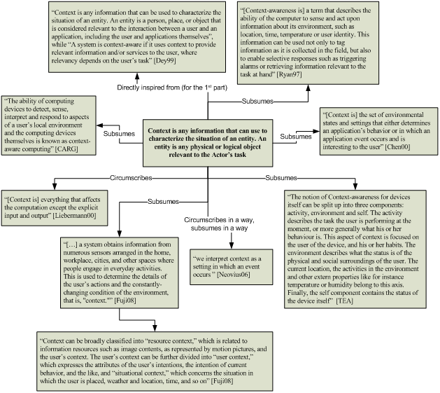 Le schéma à droite (tiré de [Roy10*]) met en relief les liens entre les définitions les plus usitées du Contexte et celle que je propose ici. Certaines références doivent être retouchées (il manque un « i » à Fujii, entre autres), mais les citations sont telles quelles.