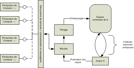 La mise à jour de l'espace contextuel est un cycle. Un Acteur donné publie ses besoins, qui sont mis en correspondance avec ce que d'autres Acteurs publient puis filtrés, côté requérant ou côté producteur (j'aimerais qu'on en vienne à filtrer sur le noeud le plus à propos, mais c'est un projet à moyen terme) de manière à offrir au demandeur ce qui peut l'intéresser. L'espace contextuel se remplit donc, et peut être géré par le demandeur comme bon lui semble (c'est « son monde » après tout).