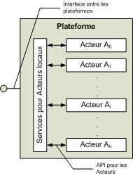 Certains services de la plateforme ont déjà été mentionnés plus haut, en particulier indiqués dans le tableau ci-dessous. La colonne Type indique si le service est offert par la plateforme aux Acteurs qui y résident (API) ou s'il s'agit d'un service entre plateformes (Réseau). Dans le tableau, le terme « sa plateforme », en rérérence à un Acteur, signifie la plateforme sur laquelle l'Acteur loge, sur laquelle il s'exécute. La plateforme est elle-même un composant logé sur un noeud, qui sert de conteneur pour d'autres composants (les Acteurs), et assure la présence d'une gamme minimale de services de base.