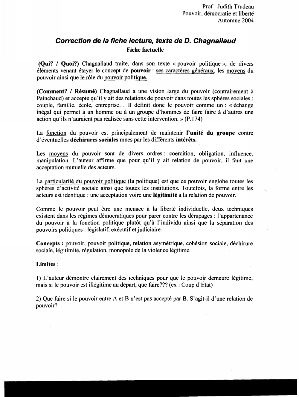 Un exemple de fiche lecture (un peu longue mais très complète; vous pouvez être plus brèves et plus brefs que cela) pour un cours de politique, fiche gracieusement offerte par Judith Trudeau (qui utilise beaucoup cette technique), est disponible ici (un .jpeg).